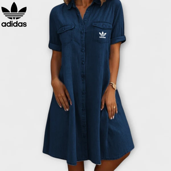 Designed with subtle structure, the dress features a gently flared hem that allows for fluid movement and a flattering drape. Rolled short sleeves and a chest pocket adorned with the iconic Adidas Trefoil logo lend an athletic yet refined edge, enhancing its versatile appeal. This piece brings comfort and confidence in equal measure.