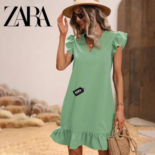 Featuring subtle ruffled sleeves and a soft V-neckline, this dress adds just the right touch of femininity without trying too hard. The hem is adorned with a delicate flounce, adding movement and charm to each step. Pair it with a straw hat and woven bag for a classic Mediterranean-inspired look.