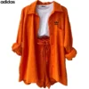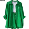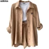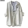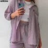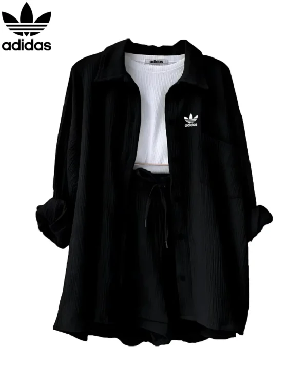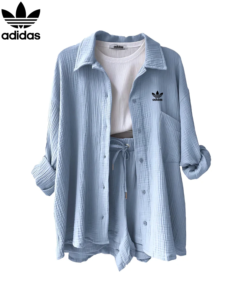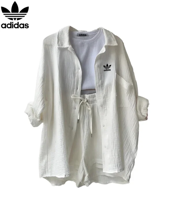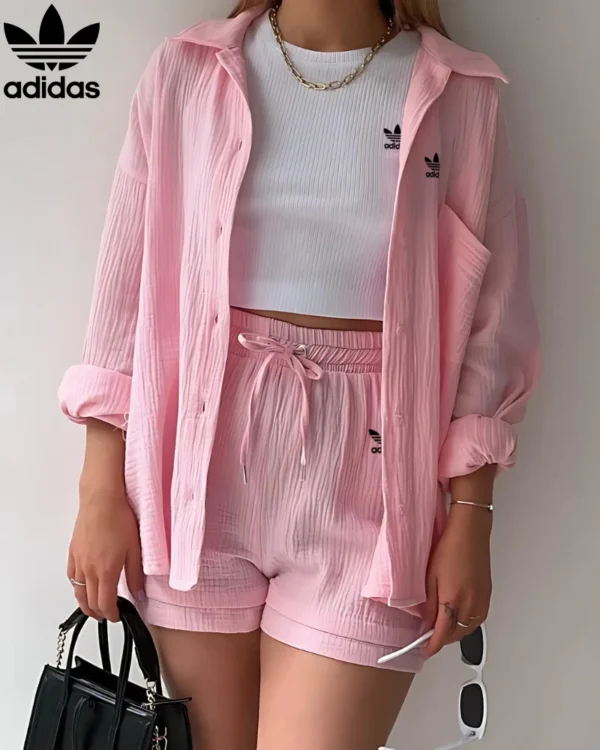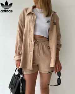 The Adidas – New Trendy Set doesn’t just shine on its own—it plays well with your entire wardrobe. Pair the button-up top with high-waisted jeans or flowy skirts for a breezy daytime look, or mix the shorts with a cropped tee or bikini top for beach-ready vibes. Its neutral tone and modern texture make styling a breeze, giving you endless outfit combos with minimal effort.