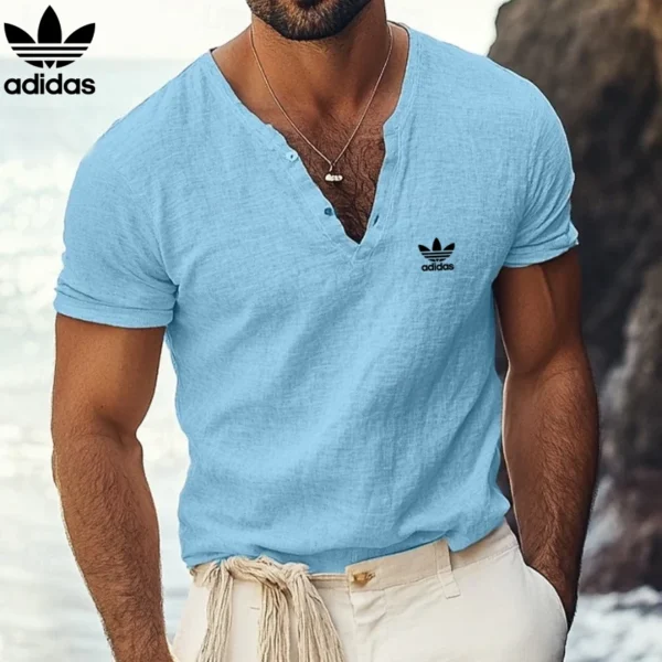 Picture yourself on a beach stroll at sunset or enjoying a relaxed dinner with friends. The Adidas – V-Neck Linen Shirt is the perfect piece to wear with your favourite chinos or shorts for a look that’s effortlessly cool and confident. It’s more than just a shirt—it’s the feeling of a perfect summer day.